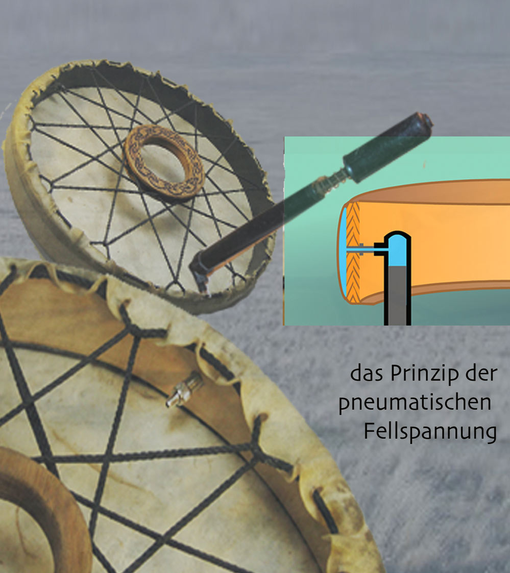 Hier gibt es nun die Lösung: die MagicCedarDrum Eine traditionelle Framedrum mit normalen Aussehen ohne Schrauben, Spanner etc. und trotzdem stimmbar. Ein aufpumpbares Luftpolster zwischen Holzrahmen und Rohhaut reguliert elegant die Fellspannung. Es ist schnell regulierbar und aufzupumpen mit einer normalen Fahrradluftpumpe. Nie mehr dumpf immer den Ton den ich nun will und das mit Rohhaut !!! Resonanzvolles Rahmen Trommeln wo, wann und wie ich will.